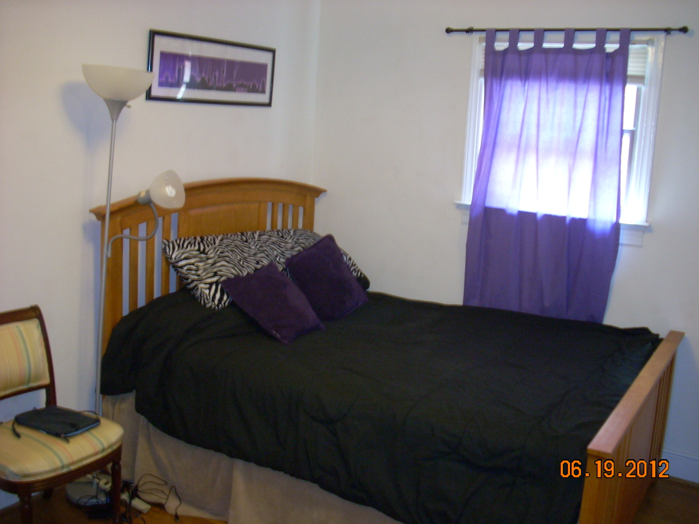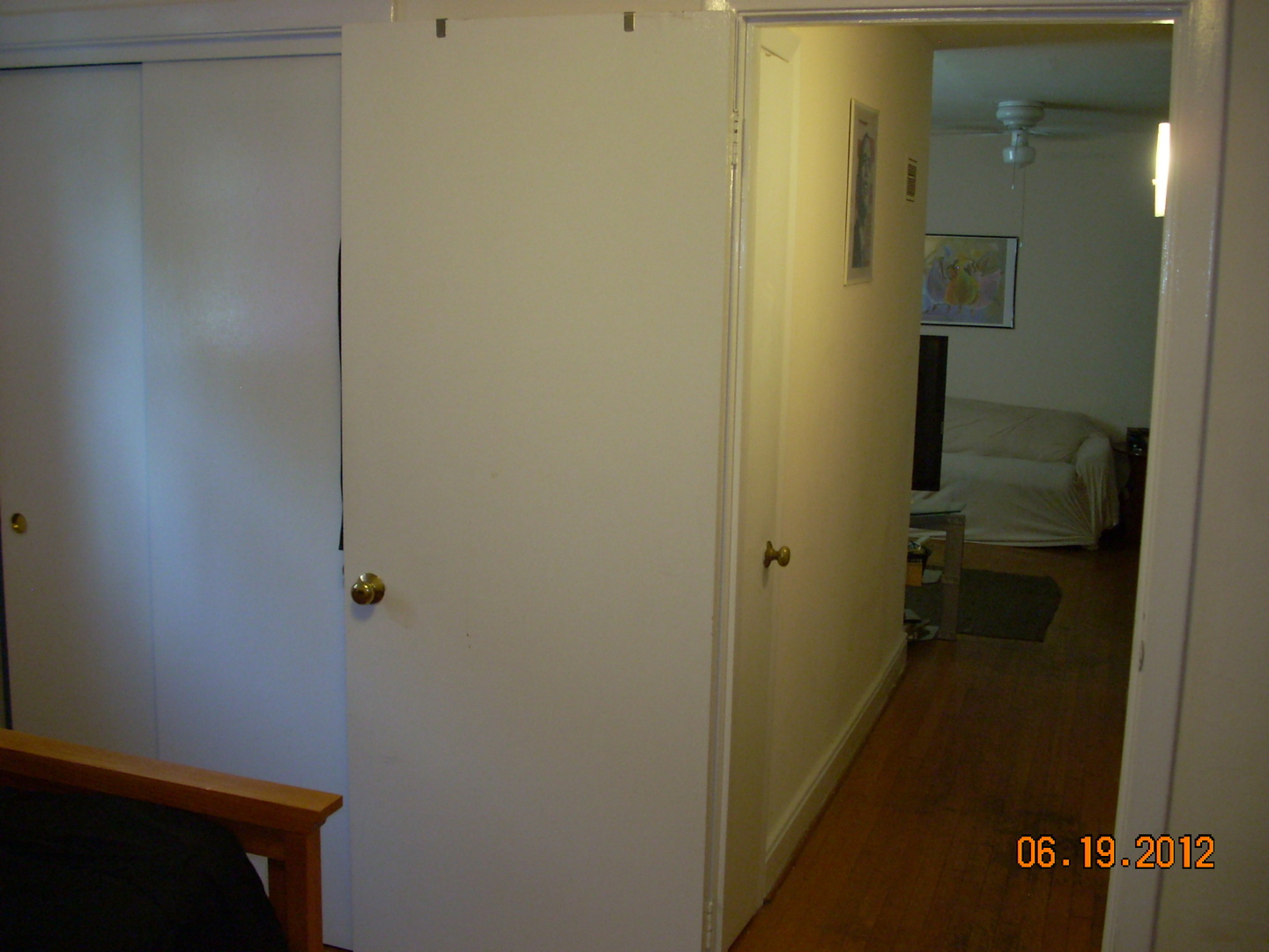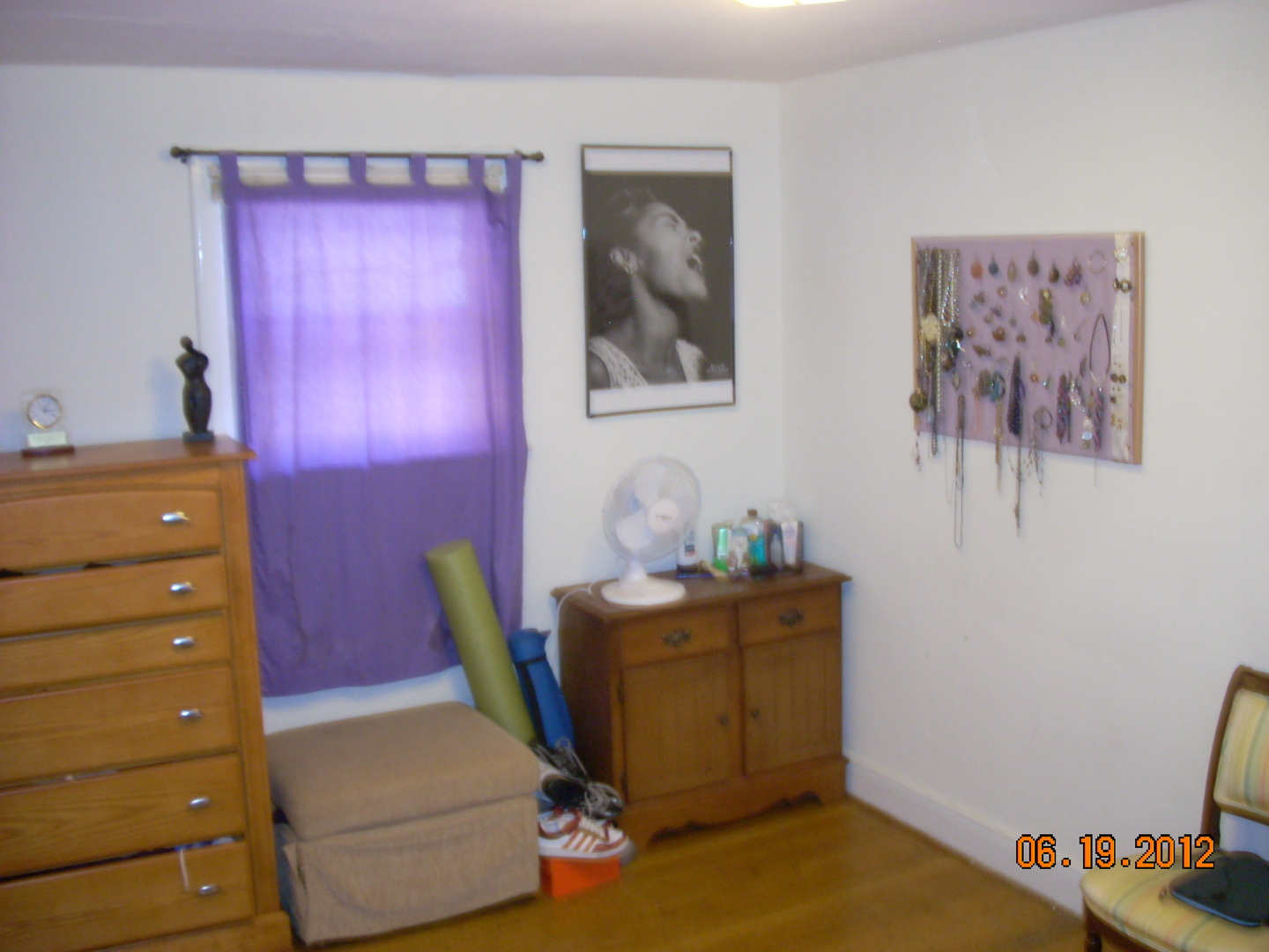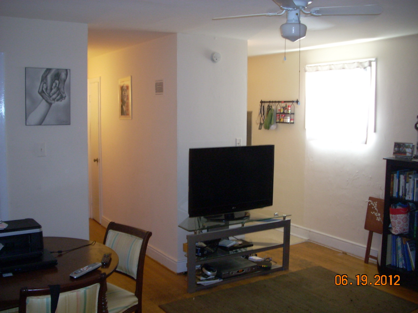 -- APPLICATION PENDING -- Upstairs apartment with hardwood floors, private stairway, one reserved off-street parking space, living room, kitchen, and full bathroom. Kitchen has a electric range and refrigerator. Gas hot water heater in the living room closet. A through the wall heat pump provides heating and cooling. There is a common exterior deck in the rear. No dogs, one cat allowed with additional animal fee and animal deposit.