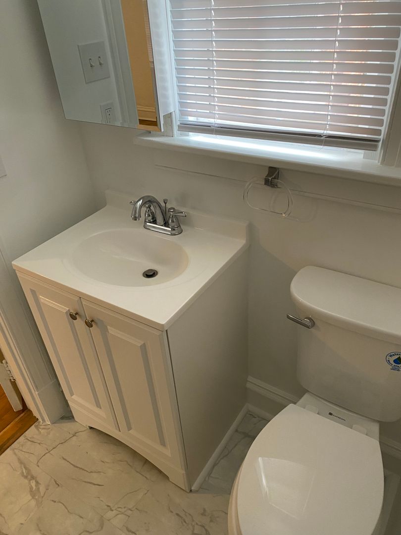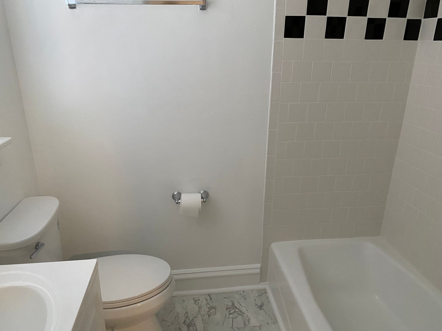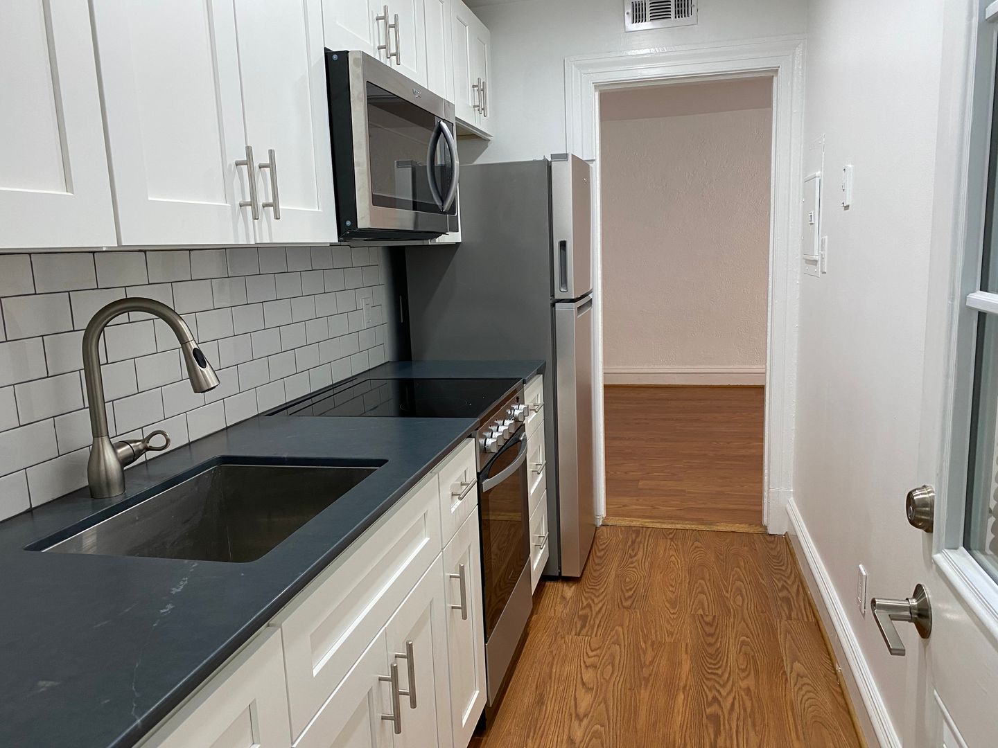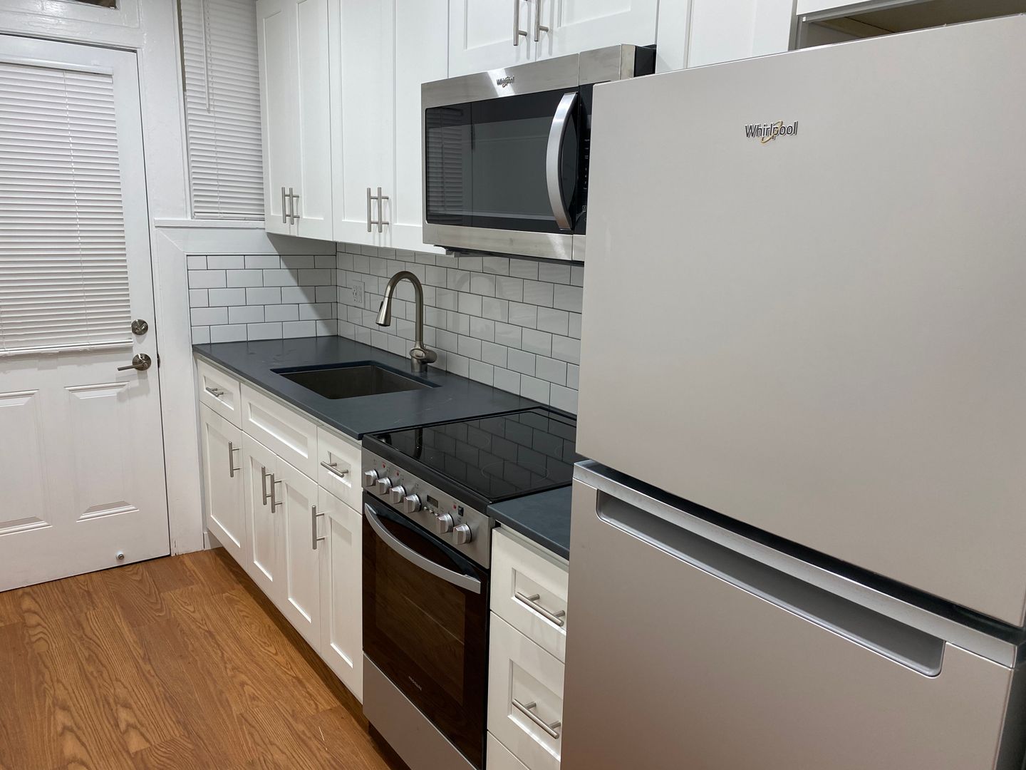 Nicely renovated one bedroom apartment on the first floor in rear. Unit has hardwood flooring and central air. Newly renovated galley kitchen with a range, refrigerator, and microwave vent hood. Granite stone countertops with ceramic tile backsplash. Renovated ceramic tiled bathroom. Heat pump provides heating and cooling. Off-street parking available. Locked entry to building. Laundry access in building.